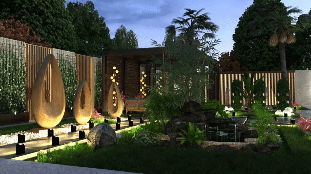 - الإضاءة: لا تقلل من أهمية الإضاءة. فهي لا تزيد الأمان فحسب، بل تخلق جوًا ساحرًا في المساء وتبرز أجمل عناصر حديقتك.